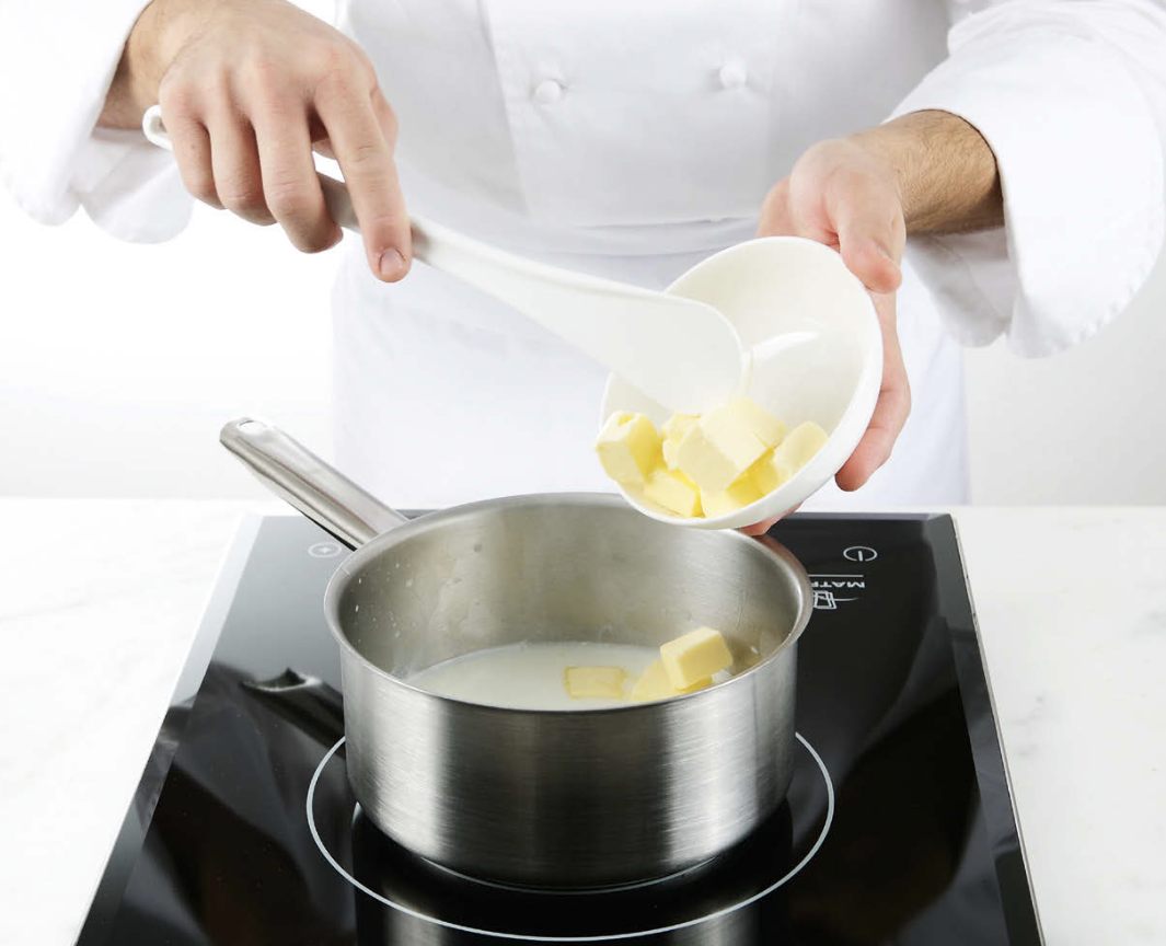 Le beurre doit être coupé en petits dés afin de fondre rapidement pendant que le lait et l’eau arrivent à ébullition.