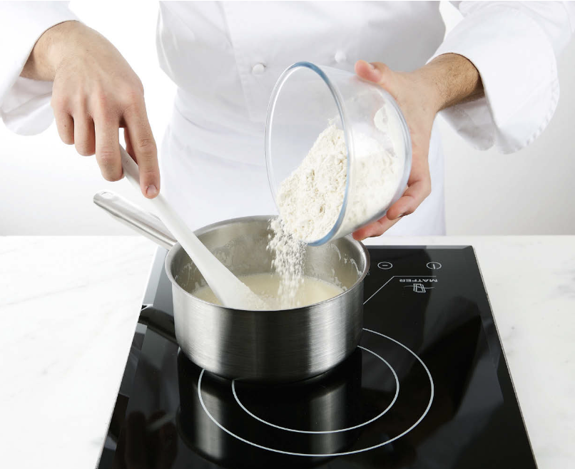 Retirez la casserole du feu, puis ajoutez toute la farine d’un coup. Mélangez vigoureusement avec une spatule jusqu’à obtenir une pâte lisse et homogène.