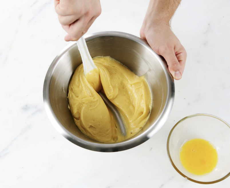 Incorporez ensuite les œufs battus petit à petit à la spatule, en mélangeant bien entre chaque ajout.